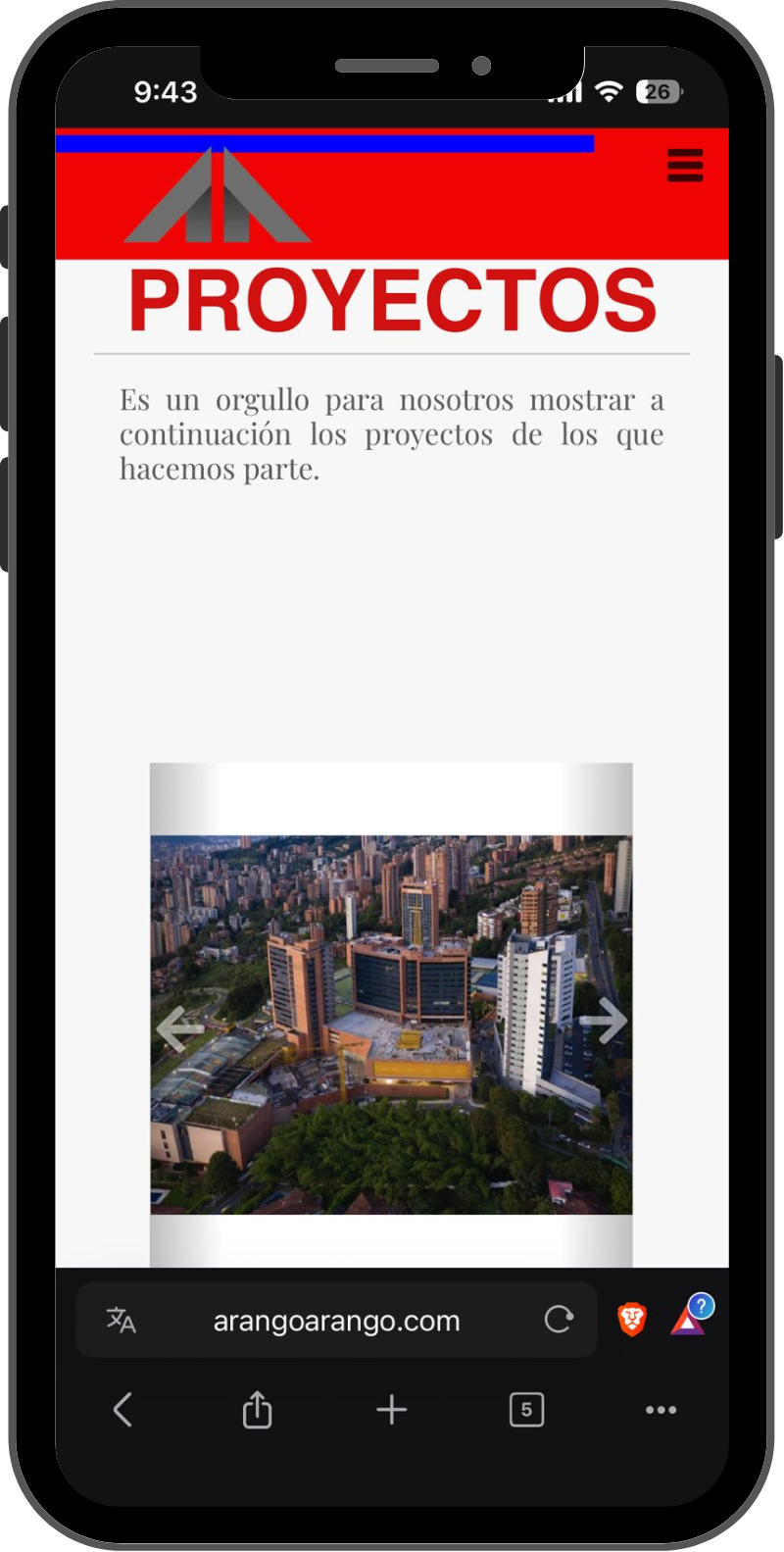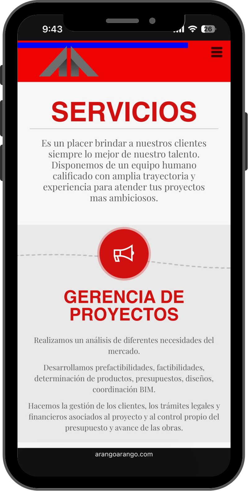 El objetivo fue crear una plataforma visual minimalista y elegante que representara el sector técnico-constructivo sin recurrir a clichés, destacando de forma clara servicios como gerencia de proyectos, interventoría y supervisión técnica. Al mismo tiempo, se buscó aumentar la confianza de clientes públicos y privados mediante una presentación moderna y móvil, mientras el equipo de Arango Arango puede gestionar autónomamente proyectos, casos de estudio y testimonios.